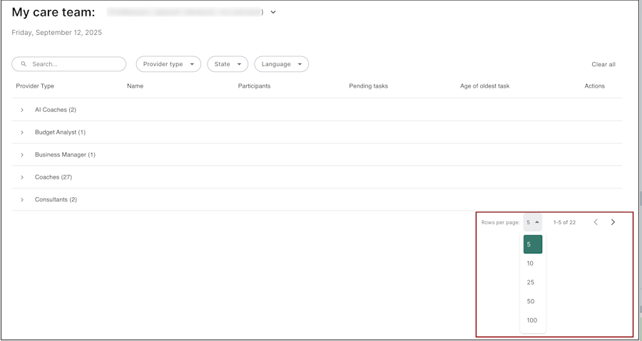 To adjust the number of rows per page, use the dropdown menu at the bottom right of the screen. Use the left and right arrows in this same area to navigate between pages.
